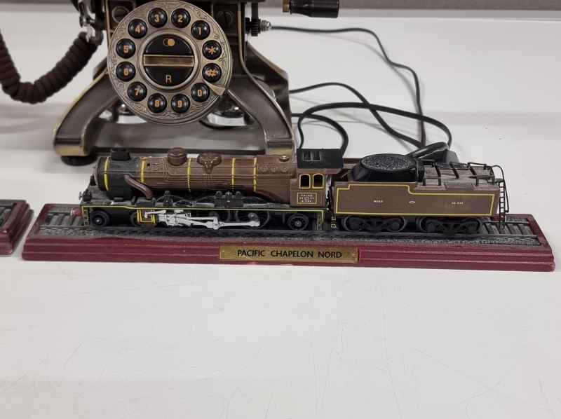#2371 - Vanhan junaradan osia + 3kpl koristevetureita ja vanhan näköinen pöytäpuhelin