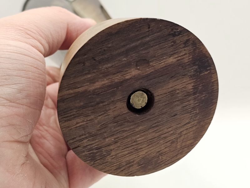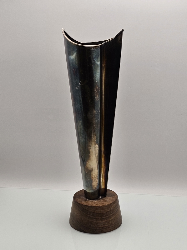 #855 Hopeinen Tapio Wirkkala Liekki -maljakko puujalustalla v.1966, 916h, br. 319g