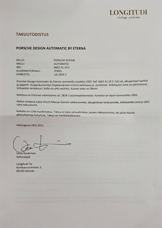 Ref: 6602.41.10S. Mukana laatikko, aitoustodistus, vaihtoranneke ym. H: 38,5mm
