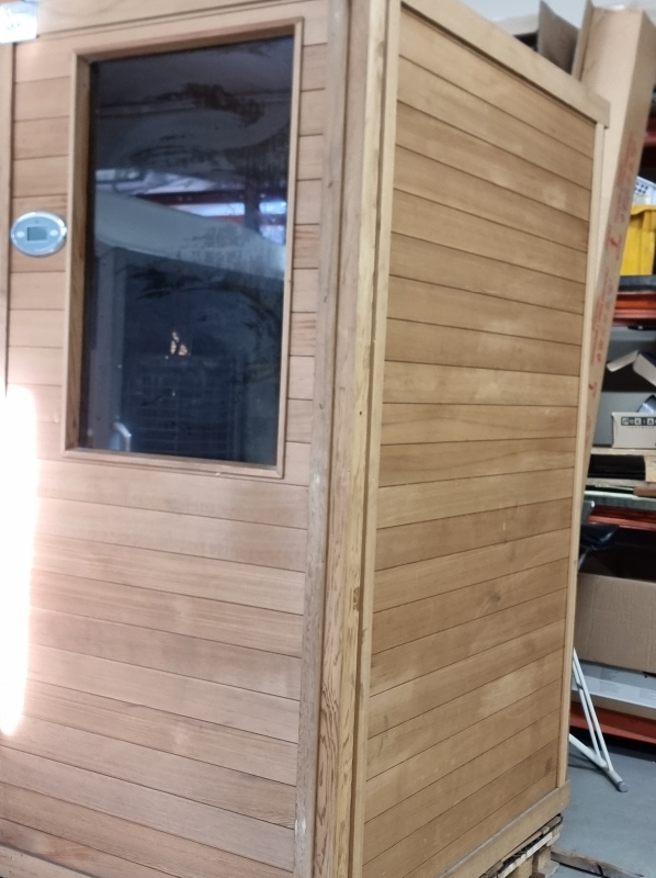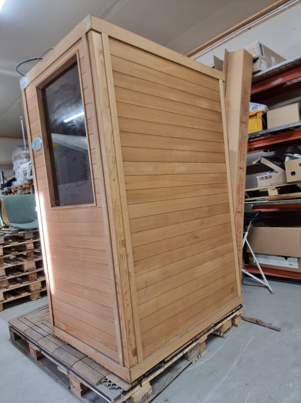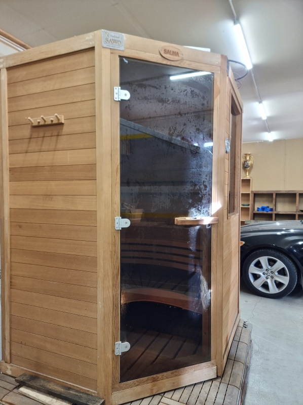 Hyvässä kunnossa. Mukana kiuas + löylymittari + kiulu + valot. Leveys 135cm, korkeus 205, syvyys 156cm