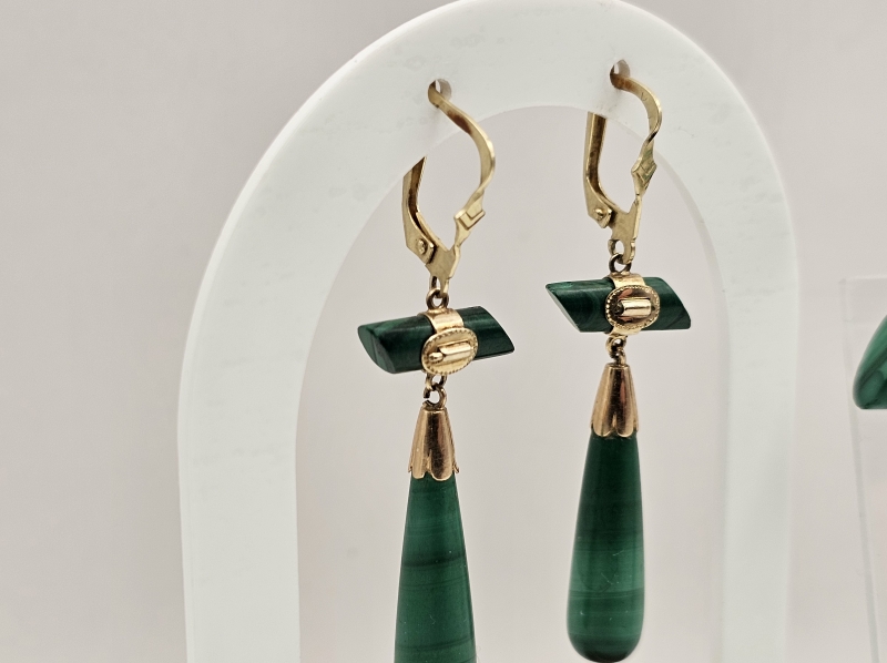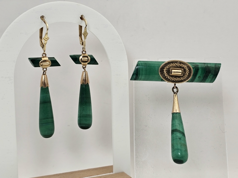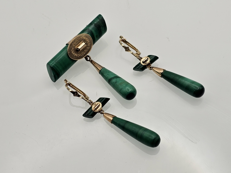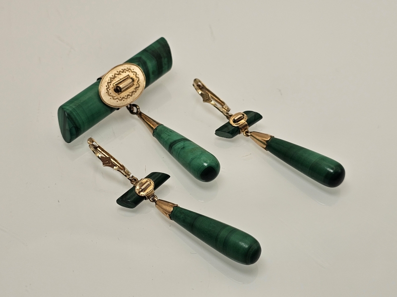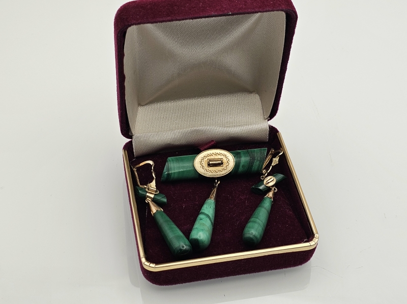 #846 14k kultainen venäläinen rintakoru ja korvakorut malakiitilla, 23,6g