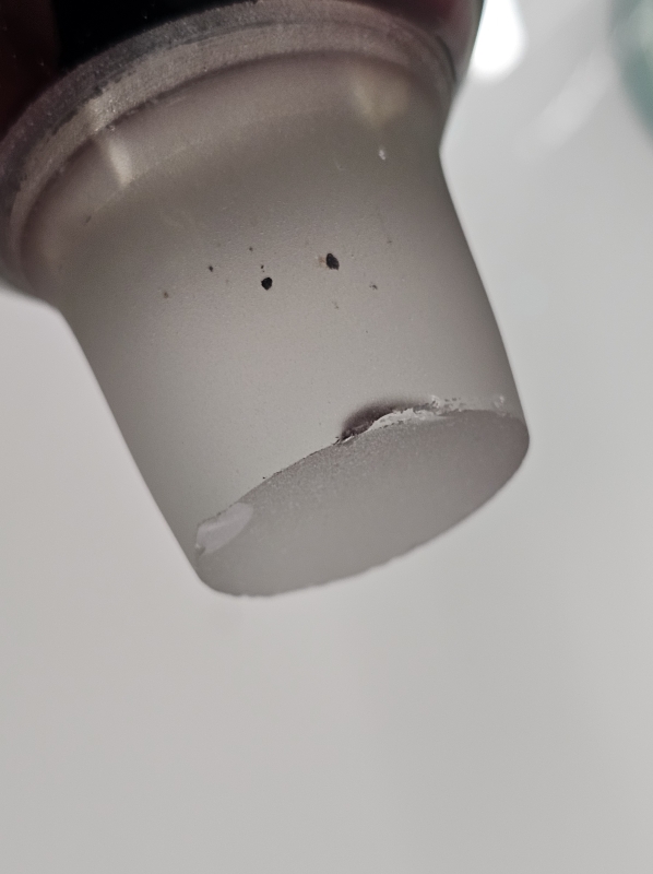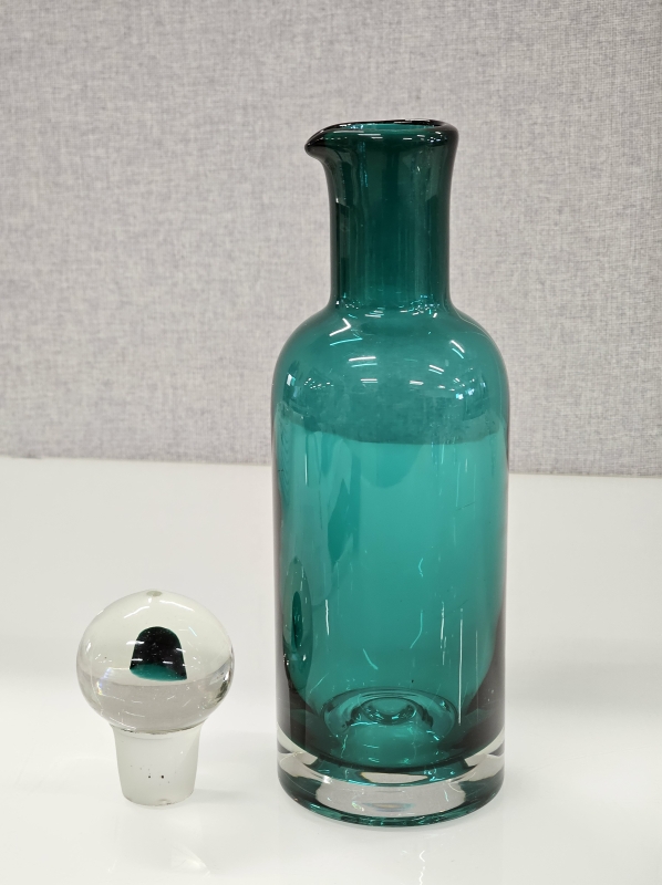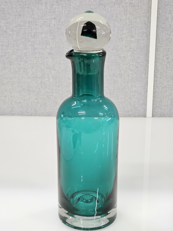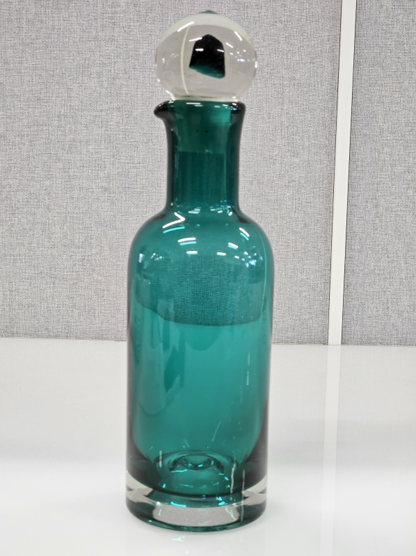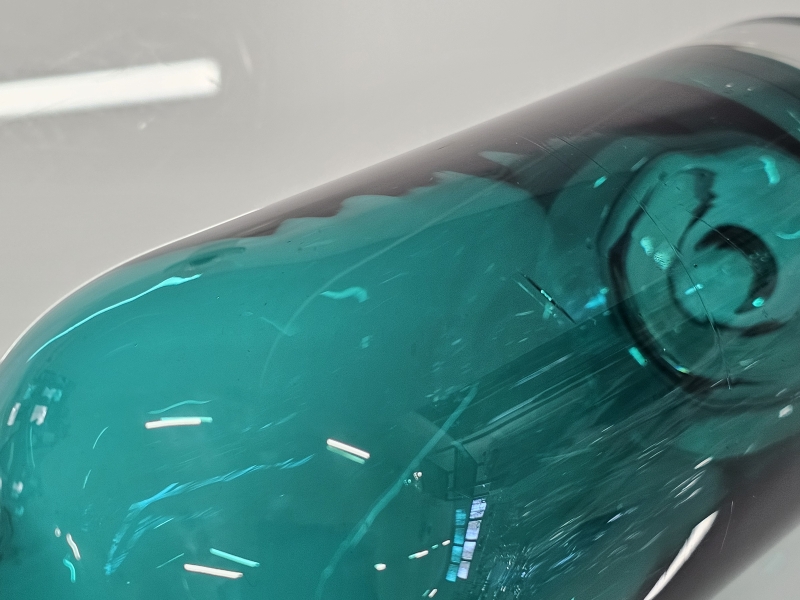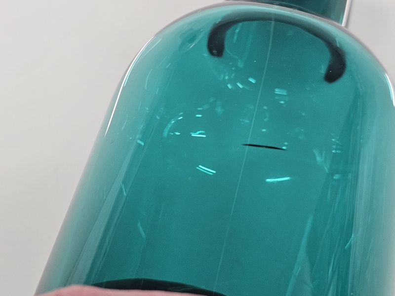 Korkissa kolhuja sisäpuolella, pullossa noin 1,5cm sisäinen halkeama. K: 32cm