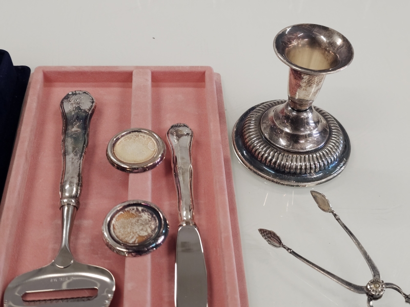 #1131 Erä hopeaa: Chippendale -ottimia, kynttilänjalka ja juustonapit + hopeoidut pihdit