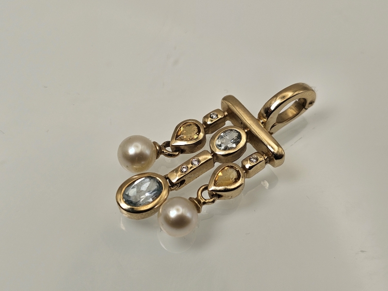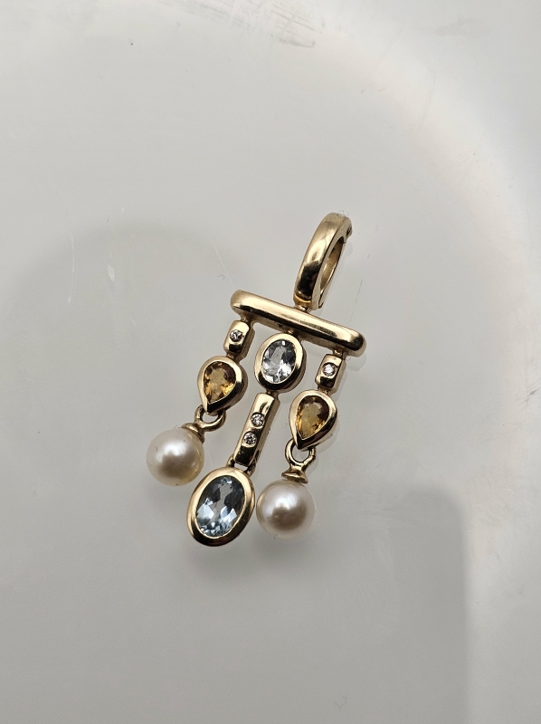#1134 14k kultainen riipus jossa mm. helmet, timantteja ym., 5,18g
