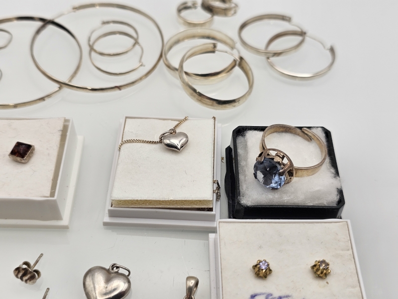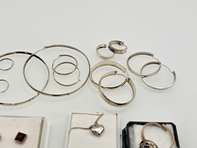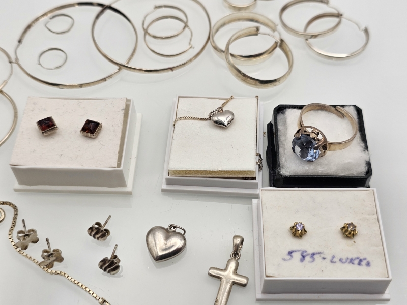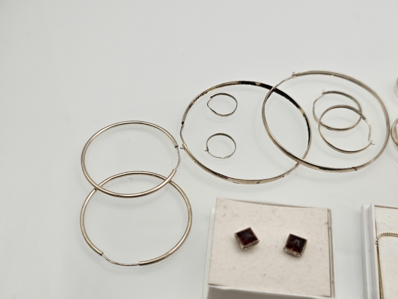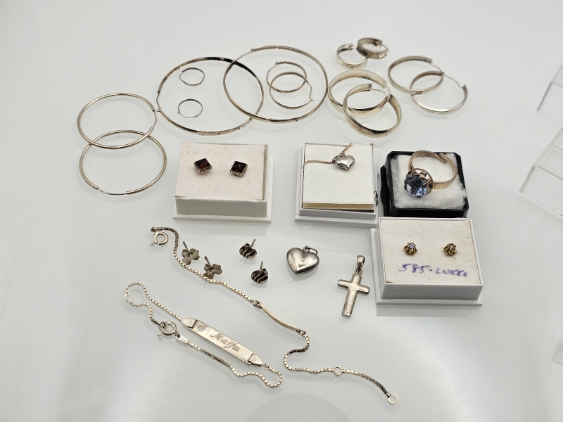 #1192 Erä hopeakoruja joista yhdessä korvakorussa 14k lukko