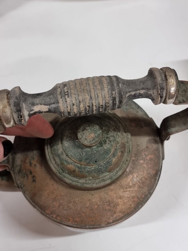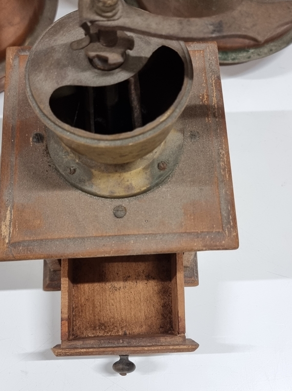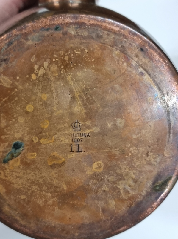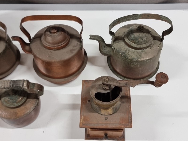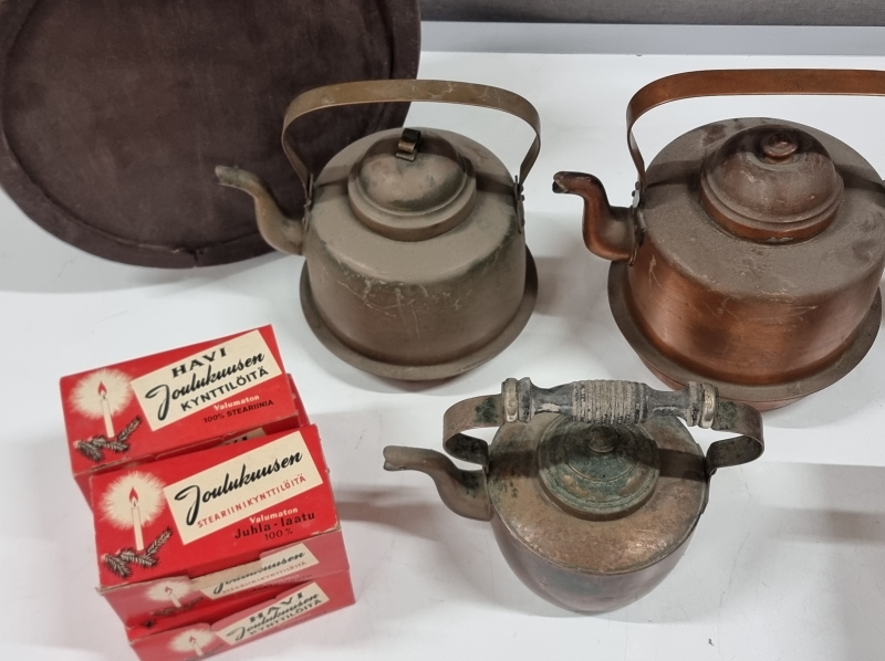 #2233 4kpl kuparipannuja, joista yksi Kalske Pori + kahvimylly ym.